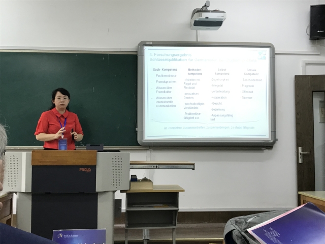 在分论坛讨论中,王婀娜老师宣读了研究论文“Forschung zum Konnotations-und Entwicklungsprozess sowie Trainingsmodus interkultureller Kompetenz bei Germanistikstudium——basierend auf der empirischen Studie chinesische-deutscher Joint Ventures”,对大学德语教学中的跨文化能力培养进行了探究,引起了在场专家及师生的热烈讨论与交流。