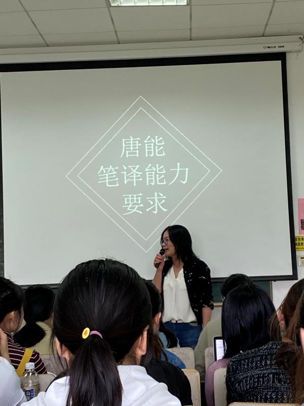 最后,在提问环节,当有同学问到华为公司的应聘条件时,她着重强调:拥有扎实的双语基本功至关重要,在提高自身外语水平的同时,切莫忽略对汉语的学习。讲座结束时,她还不忘给同学们提出几点建议:第一,尽责、尽力、尽心;第二,把握“电梯60秒”;第三,自我激励,选择快乐。
