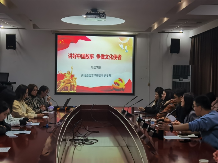 2020年12月29日下午,英语语言文学研究生党支部在学院306会议室举办了以“讲好中国故事,争做文化使者”为主题的研究生党建“一院一品牌”项目互访活动,向来访的兄弟学院研究生支部展示交流支部党建工作特色。参会人员包括党支部书记瞿莉莉,学院研究生辅导员梁作甲,支部学生党员、积极分子、环境工程专业研究生党支部副书记代萌,环境学术研究生党支部施常洁,工文艺研究生第一党支部任展翔和杨礼彬,研究生党支部书记联合会代表等20余人,会议由党支部副书记董丽媛主持。