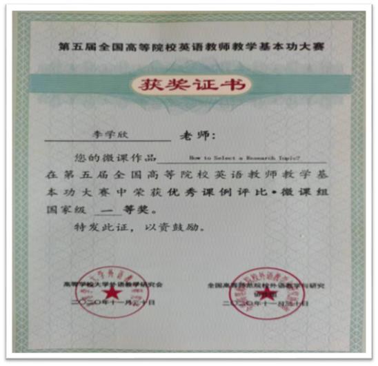 由高等学校大学外语教学研究会和全国高等师范院校外语教学与研究协作组共同主办的第五届全国高等院校英语教师教学基本功大赛评选工作圆满落幕。taptap点点公共英语教研中心教师李学欣的微课作品“How to Select a Research Topic?”从竞争激烈的众多参赛作品中脱颖而出,最终斩获2020年度优秀课例评比·微课组“国家级一等奖”。