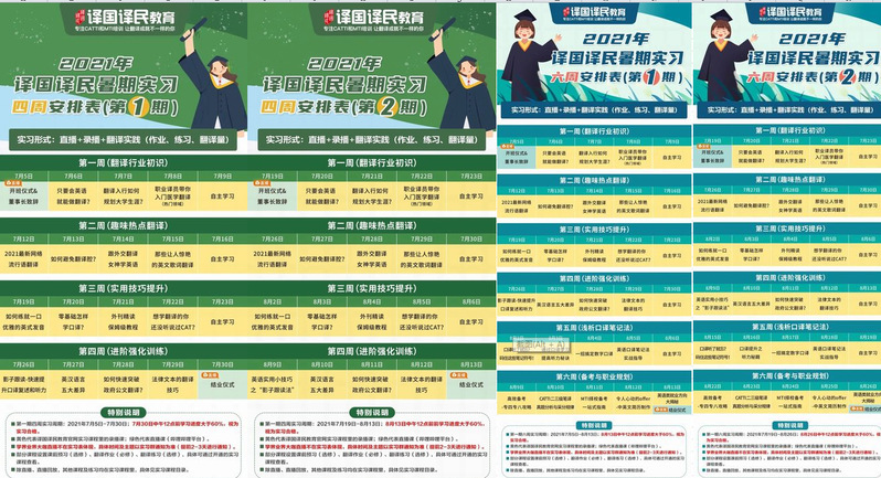 译国译民公司是中国翻泽协会理事单位、全球语言服务商百强、全国翻译专业学位研究生教育实习基地,旗下拥有译国译民翻译、译国译民教育、言之友悟等核心子品牌。此次暑期线上实习项目自2021年7月5日持续到8月27日,分两期进行,两期培训内容相同,每期又分别分为四周和六周实习。第1期四周实习时间为2021年7月5日至7月30日,六周实习时间为2021年7月5日至8月13日。第2期四周实习时间为2021年7月26日至8月13日,六周实习时间为2021年7月26日至8月27日。基于线上实习的灵活性,学生可根据个人时间自由安排。