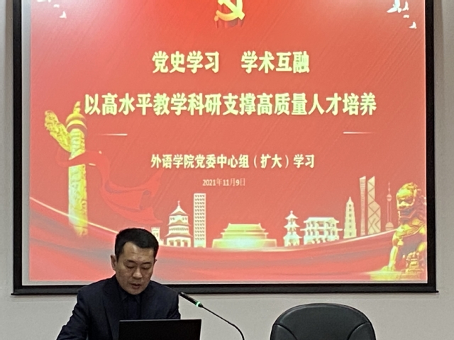 曲德强向前来指导工作的领导们表示热烈欢迎,并以新修订的《中华人民共和国教育法》为题进行了导学。他就新法修订的过程、意义、修订内容、贯彻落实等进行了详细的解读,并介绍了taptap点点官方网站党史学习教育的工作开展情况。他指出,学院党委通过党史学习教育,鼓励引导广大党员教师将党史学习和教学科研紧密结合,互融互促,切实把所学所悟转化为工作动能和发展成效。积极担负社会使命,在落实立德树人根本任务的基础上发挥专业优势,谋划推进课程思政、承担对外宣传,科研与党史理论深度互融,积极申报高水平科研基金项目,从“翻译世界”转向“翻译中国”。学院涌现了一批优秀团队和先进个人。这些学习成果一方面为教学积累了丰富的案例素材,另一方面也通过外语向世界讲述中国故事、传播中国声音,展示真实、立体、全面的中国,不断加强我国国际传播能力。