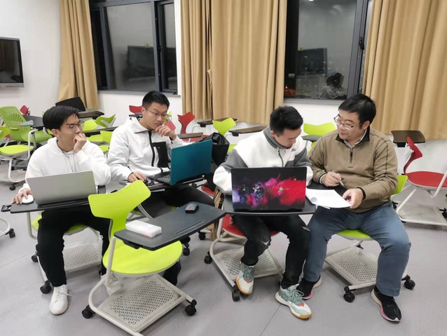詹其文教授(右一)、陈建老师(右三)与李学欣老师(右二)点评学生汇报