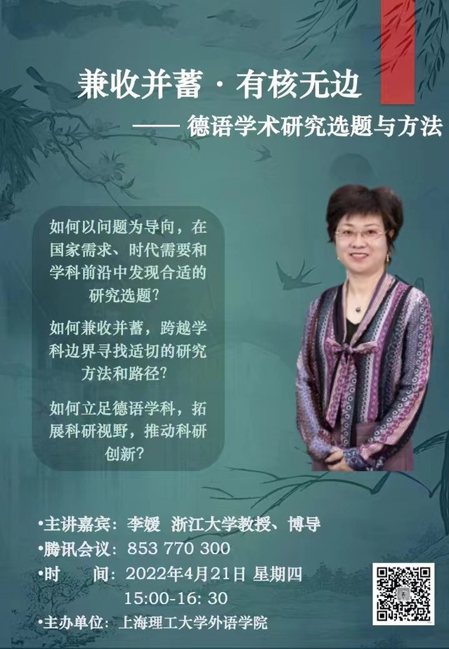 2022年4月21日下午,浙江大学李媛教授为taptap点点官方网站德语系师生带来了一场干货满满又充满趣味的线上讲座,为疫情之下的德语系师生带来了精神滋养与学术启迪。本次讲座由王婀娜副教授主持,德语系全体师生参加。