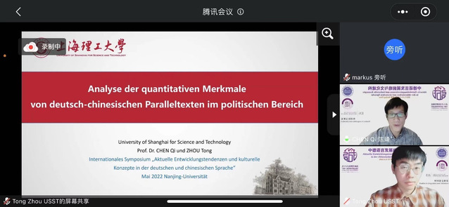 我校陈琦教授、王婀娜副教授、倪晓姗博士、在读博士唐骋老师和2020届MTI学生周通参与会议并就不同议题分别作了报告。陈琦教授与同济大学董菁副教授合作了大会主旨报告Echo-Konstruktionen aus Sicht der dialogischen Syntax,与周通合作了分组报告Analyse der quantitativen Merkmale von deutsch-chinesischen Paralleltexten im politischen Bereich;王婀娜副教授在Empirische Sprachforschung的分组讨论中作了题为Analyse des Online-Lerndrucks chinesischer germanischer Studenten während der Epidemie的报告;倪晓姗博士在Theoretische Sprachforschung的分组讨论中作了题为Eine rollentheoretische Diskursanalyse der Sicherheitspolitik Deutschlands的报告;唐骋在Vergleichende Studien zum Deutschen und Chinesischen的分组讨论中作了题为Die lautliche Integration des chinesischen Lehnguts in die deutsche Gegenwartssprache的报告。