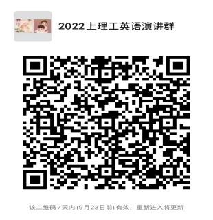 请报名参赛的同学们扫码加入2022上理工英语演讲微信群,以获取演讲技巧指导以及比赛通知。