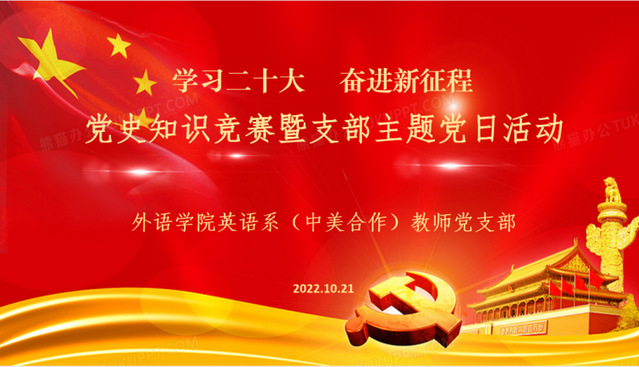 为学习宣传贯彻中国共产党第二十次全国代表大会精神,英语系(中美合作)教师党支部于10月21日中午线上举行“学习二十大,奋进新征程”党史知识竞赛暨主题党日活动。本次活动由英语系(中美合作)教师党支部书记黄芳主持,组织委员倪锦诚负责竞赛试题统筹,宣传委员沈谢天担任现场记分和总分核算工作。