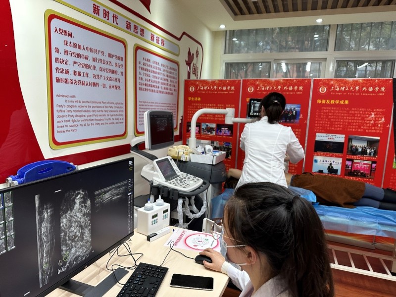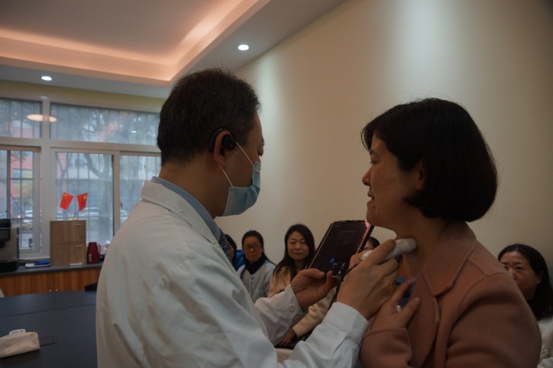 讲座后,韩宝三主任亲自为60余位教师进行现场甲状腺超声检测并就甲状腺和乳腺等问题提供了咨询建议。王文娟主任就老师们最关心的月经失调、痛经、多囊卵巢综合症、卵泡监测、备孕、绝经期综合症等问题给予了耐心、详细的解答,针对妇科体检发现的问题如何进行进一步检查,也给出了建议。乳腺超声是一项比较费时的检测,教师热情高,做检测的人数多,等候时间较长。为了能让所有排队的教师都能做检测,韩宝三主任所带的两位博士医生陆森和董爱萍以及他们的助手一直坚持到晚上8点半,为所有老师做完检测后才结束义诊。
