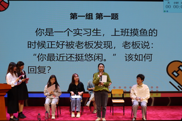 比赛共分为两轮,第一轮先进行“练练心眼子”的比拼,涉及“高情商回复”及“回答杠精”两类题目,选手们限时30秒在白板上作答,并在计时结束后简要说明理由。本轮比赛十分考验选手们的临场反应能力,选手们不负众望,面对刁钻问题毫不退怯,反而通过代入情境角色的方式巧妙进行回答,尽显超高情商。选手们在面对问题中的杠精言论时也不甘示弱,似乎要与“杠精”一决高下,并顺势整顿互联网中不良的抬杠风气。看了选手们的精彩表现,场下的观众也跃跃欲试,纷纷积极上台参与游戏环节,现场气氛生动有趣。