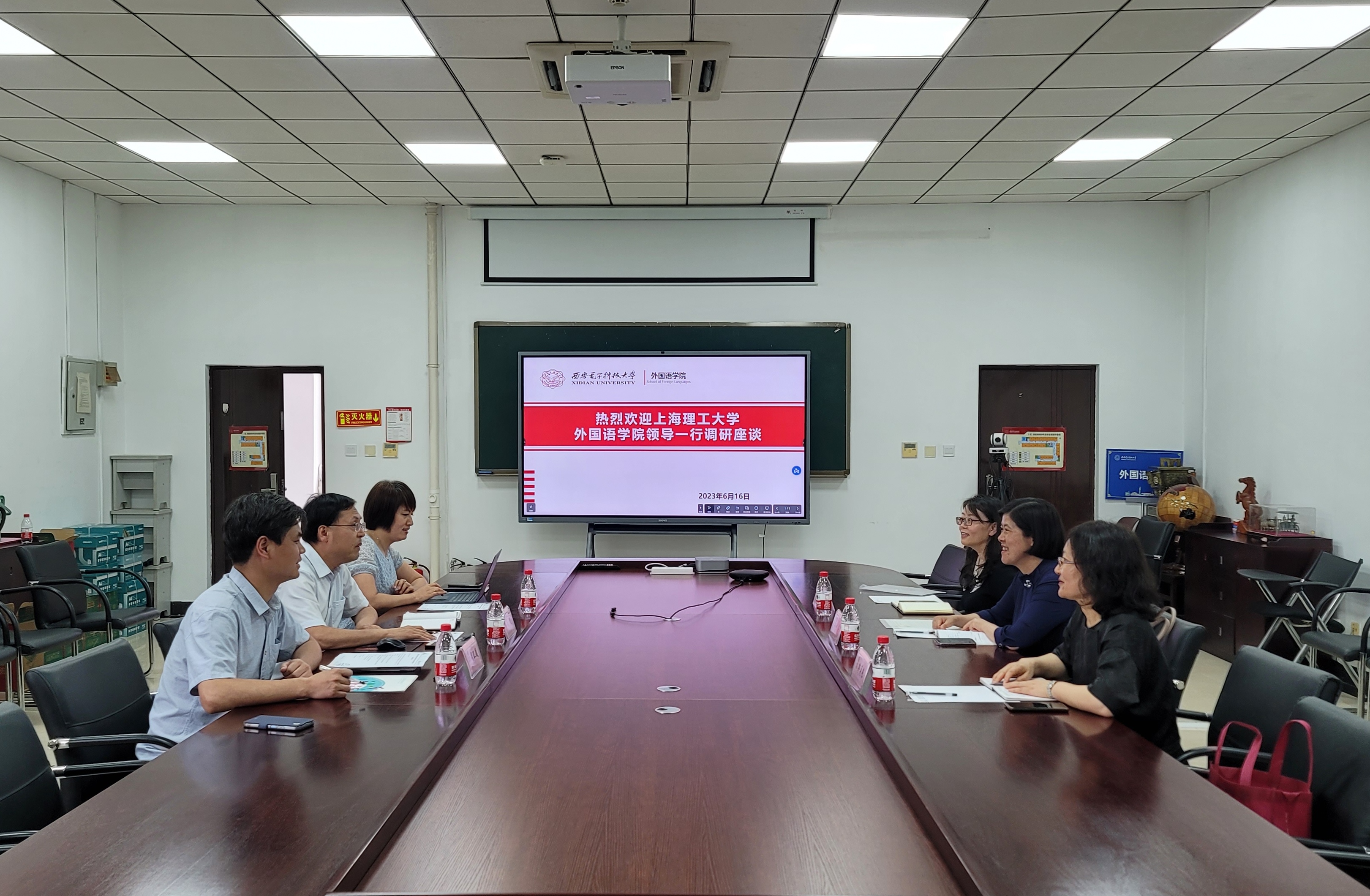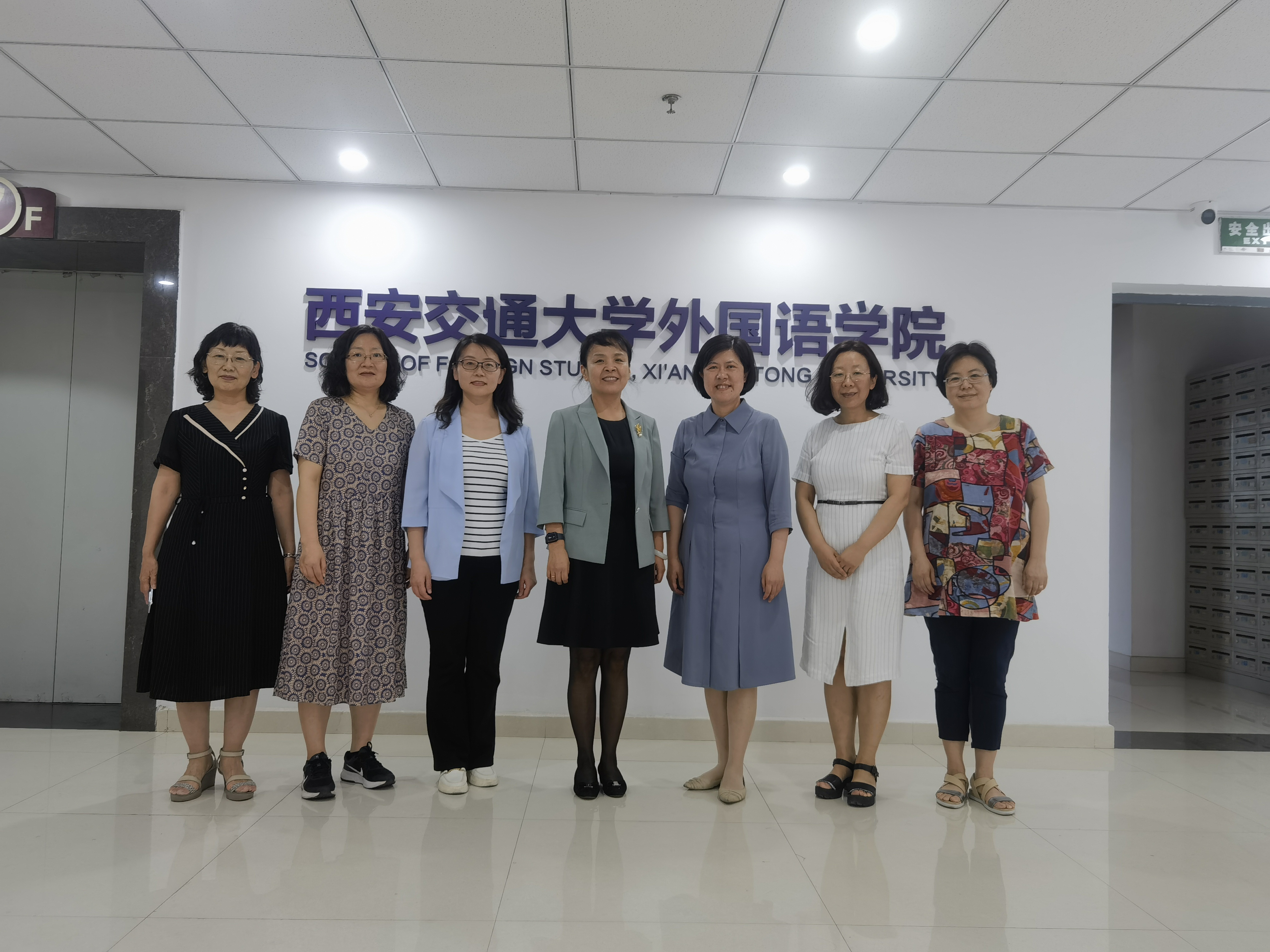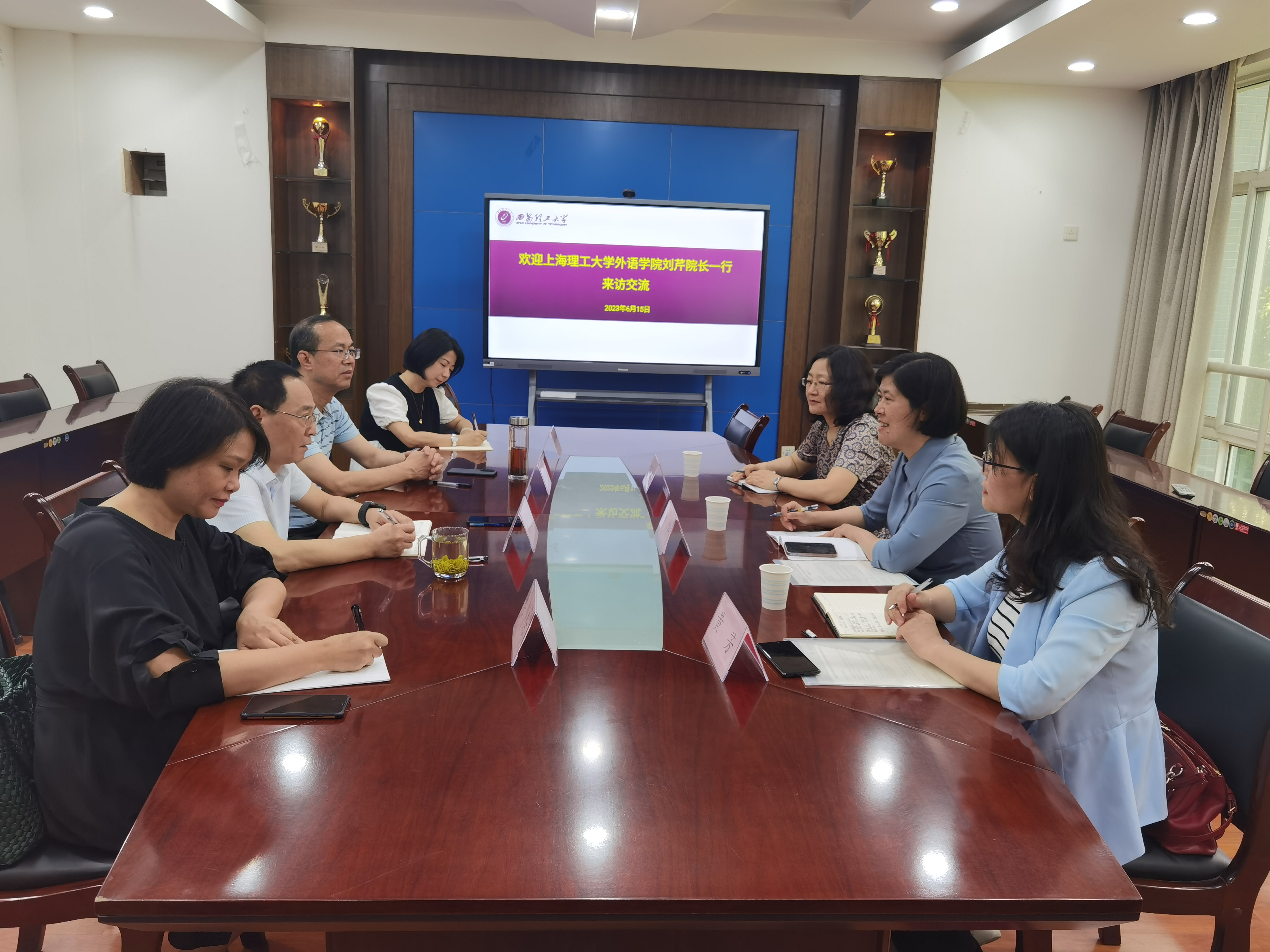 随后,刘芹一行来到西安交通大学外国语学院,与院长陈向京、副院长李莹、MTI中心主任朱元、交叉学科博士生导师孟亚茹教授进行了交流。座谈会上,陈向京就博士点建设、科研团队培养、学科专业发展等方面进行了重点介绍,刘芹就英语本科一流专业建设和研究生培养等方面作了分享。随后,双方在研究生培养、课程思政等方面进行了深入探讨,相互借鉴学习,获益匪浅。