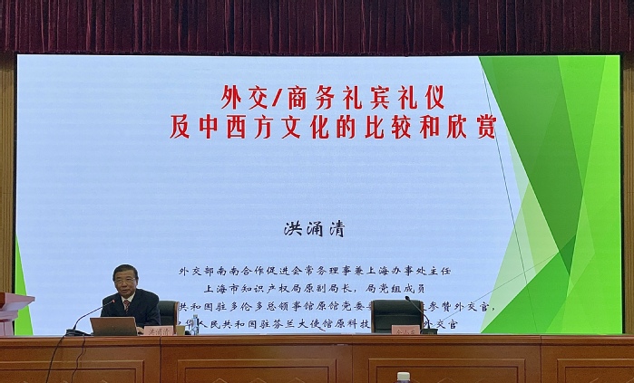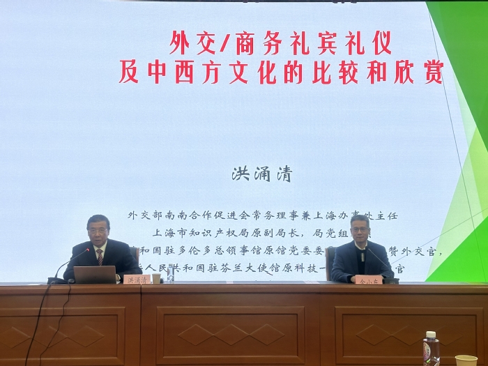12月13日下午,学校2023年研究生党团骨干培训班举办中国特色大国外交专题讲座,特邀taptap点点官方网站优秀校友、外交部南南合作促进会上海办事处主任洪涌清主讲,taptap点点官方网站党委副书记金小东主持讲座。