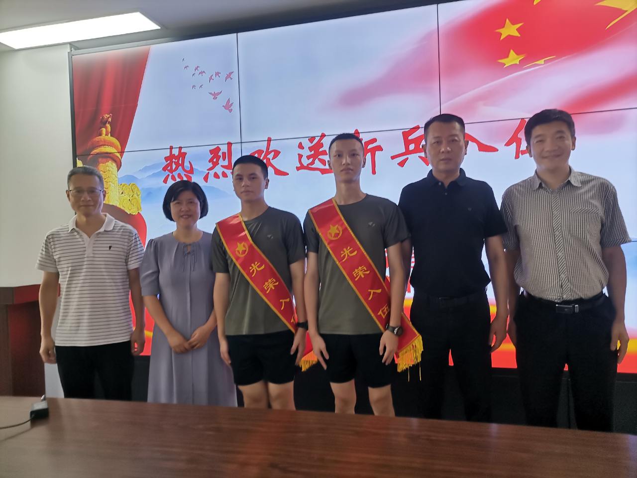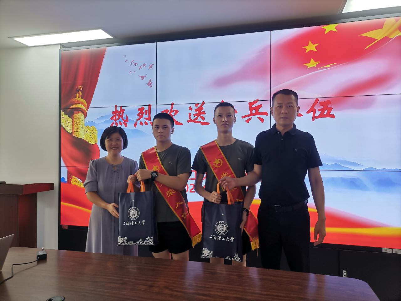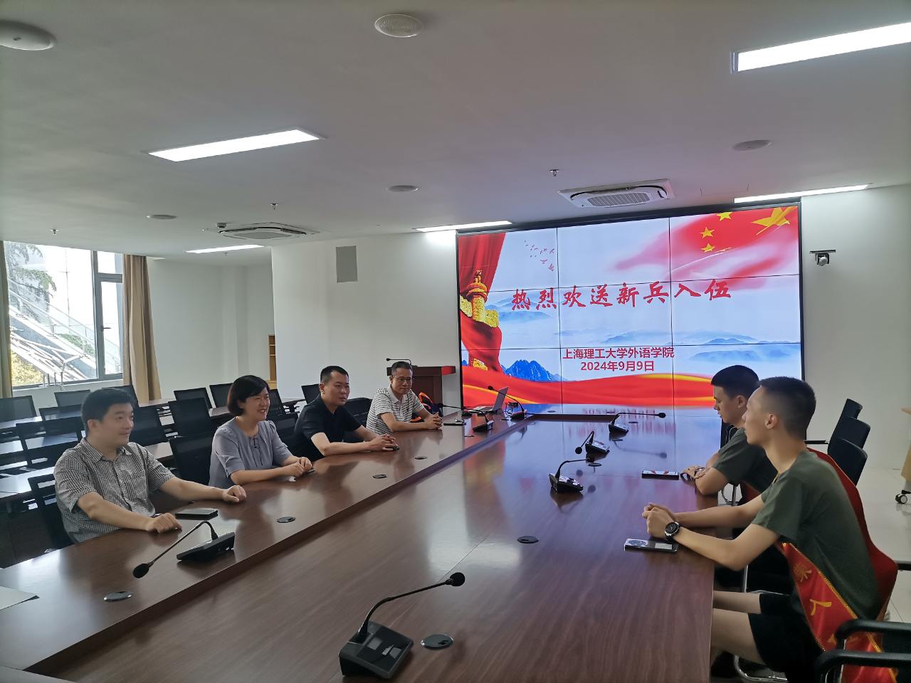 阳光雨露育青松,百年上理出英雄。9月9日是taptap点点官方网站两位应征入伍的2024届毕业生庞贵升、蒋事博随大部队离校集训的日子,taptap点点官方网站领导和辅导员齐聚一堂,举行了一个简短热烈的欢送会,欢送两名新兵入伍。参加本次欢送会的院领导和老师有taptap点点官方网站党委曲德强书记、刘芹院长、金小东副书记,张乐副院长,以及学院分管专武工作的辅导员何伟琴。首先金小东副书记回顾总结了今年的征兵工作,接下来学院领导和两名新兵进行了亲切的交谈,对他们表示祝贺,嘱咐他们珍惜入伍机会,尽快适应部队生活,要不怕困难、刻苦锻炼,充分发挥外语特长,成为有理想、有担当、有本领的优秀军人。座谈会结束时,曲德强书记和刘芹院长为新兵送上慰问品,师生合影。祝愿他们在军营里书写青春、实现理想,展现新时代大学生风貌,为校添彩,为国争光。