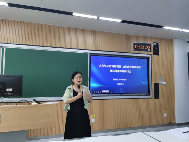 9月19日中午,英语系(中美合作)在四教107教室召开以“大力弘扬教育家精神,加快建设教育强国”为主题的师德师风专题研讨会。此次会议是系部为庆祝中华人民共和国第40个教师节组织的专项研讨活动。会议由系主任黄芳主持,英语系(中美合作)全体教师参会,赵美欧、毕一飞两位年轻骨干教师作了有关师德师风方面的主题分享。