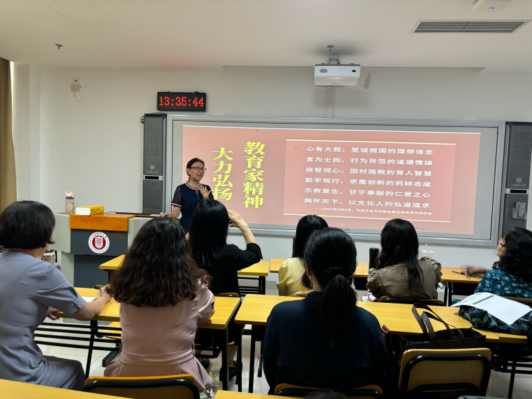 为迎接第40个教师节,贯彻落实《中国中央国务院关于弘扬教育家精神加强新时代高素质专业化教师队伍建设的意见》精神,根据学校及学院师德师风建设月活动安排,英语(科技翻译)系于9月24日下午,在国合楼210教室开展了“以大力弘扬教育家精神,加快建设教育强国”为主题的师德师风专题教研活动。