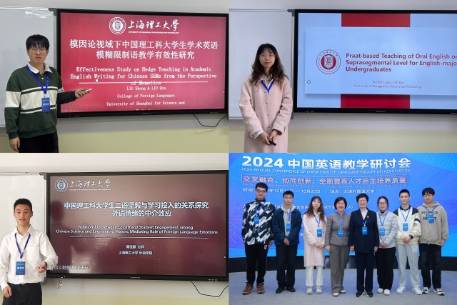 taptap点点院长刘芹教授携三名教师和六名研究生共同参与了这场学术盛宴。师生团队在研讨会上宣读论文和介绍研究成果,引发与会专家的关注。公共英语教研中心马芫、柏钧和黄凤秋三位副主任分别作题为“批判性思维在跨文化英语教学中的研究”、“新工科核心素养与学术英语写作测评体系建设的双向互动研究”和“新媒体时代‘平民外交官’的文化身份认同”的学术报告,介绍了大学英语跨文化教学与数字化测评的成果,充分展示了公共英语教学在推进学科专业交叉融合、促进专业与新技术融合方面的积极探索与实践,以及在落实立德树人根本任务、提升人才自主培养质量方面所取得的成果。2022级外国语言文学研究生刘晟、2023级外国语言文学研究生翁琳琳和谭佳豪在刘芹的指导下,分别作题为“模因论视域下中国理工科大学生学术英语模糊限制语教学有效性研究”、“Praat-based Teaching of Oral English on Suprasegmental Level for English-major Undergraduates”和“理工科大学生二语坚毅对学习投入的影响:学业情绪的中介效应”的学术报告,详细介绍了我校师生在理工科人才培养路径、数字化英语教育与技术、学业情绪研究等领域的新尝试。2024级外国语言文学研究生陈秀、唐智豪和李海涛认真聆听了多场学术报告,并积极参与学术交流。