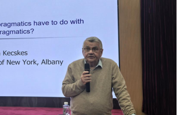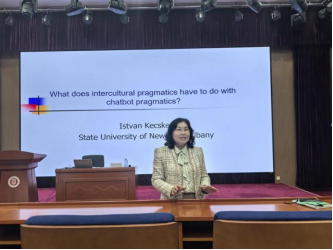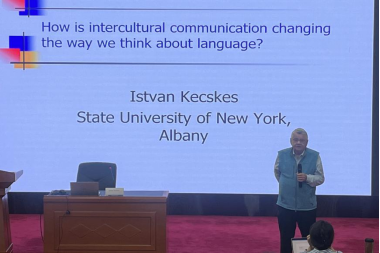 首场讲座,Istvan Kecskes教授首先介绍跨文化交际的定义、研究对象以及相关研究理论。他认为跨文化交际改变了人们对语言的理解,也改变了传统语言学的语言定义。跨文化交际的重心从言语社团转移到交际个体,语言的创造性特征不再是乔姆斯基生物属性,而是拓延为跨文化交际语境中基于二语语言系统的混合语(Lingua Franca)使用。因此,跨文化交际框架和社交规范必须是交际双方或多方共同构建而成,对于语言创造力而言,语境既有选择性作用,又有构成性作用。