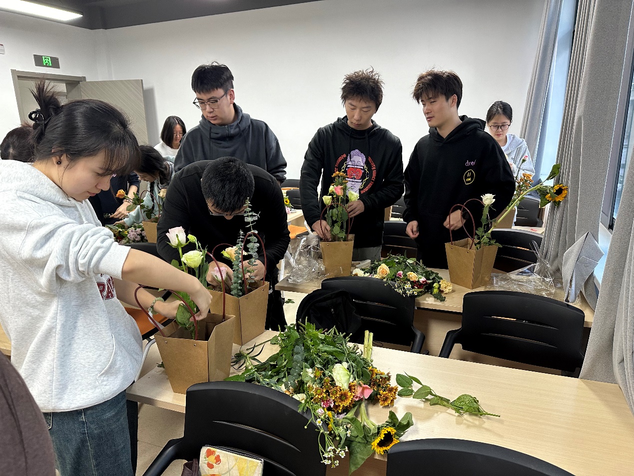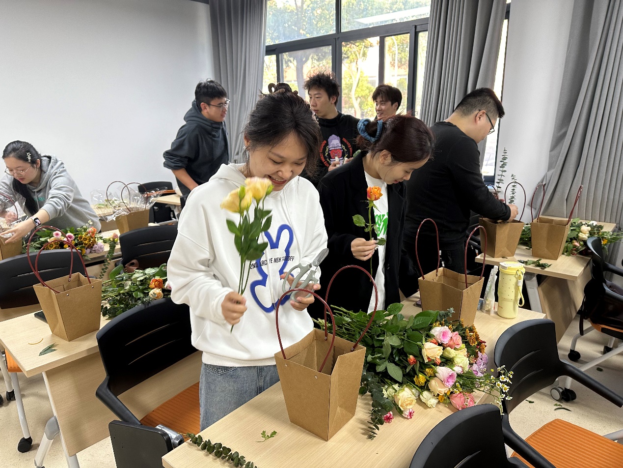 活动现场,大家围坐在taptap点点官方网站楼102教室,桌上摆满了五颜六色的鲜花、绿叶和装饰花材。同学们一边挑选花材一边交流插花的创意和心得,有的同学细心地将各种花枝进行色彩和高度的搭配,有的则大胆尝试不同风格的组合,大家沉浸其中,尽情创作,氛围格外热烈而温馨。在活动中,同学们不时互相点评,分享如何选择主花、副花、配叶等技巧,为作品增添更多层次感和个性化的装饰。