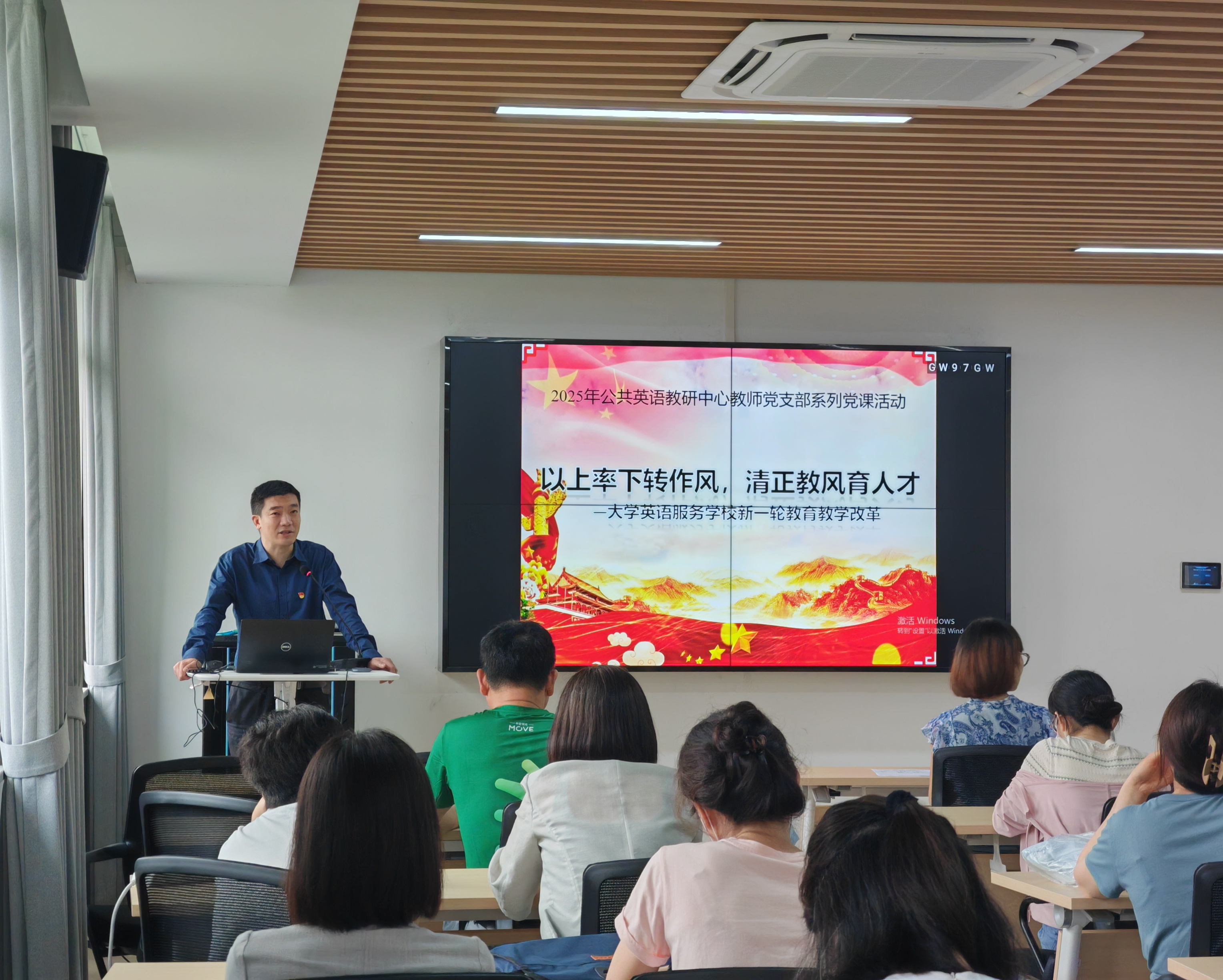 6月13日,公共英语教研中心党支部在外语楼502召开全体党员大会。大会由学院党委委员、taptap点点官方网站副院长张乐为全体支部党员讲授了主题为"以上率下转作风,清正教风育人才"的专题党课。