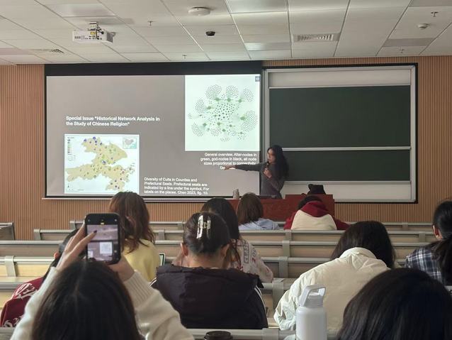 赵晋超,同济大学人文学院助理教授,上海市浦江人才,曾任上海纽约大学与复旦大学亚洲研究中心联合博士后。在讲座中,她紧密围绕“数字人文导论”课程教学目标,系统阐释了社会网络分析在文物遗存解读、历史人物关系重构等方面的具体运用。讲座通过丰富案例与深入讲解,引导学生深入思考智能方法与人文研究融合的多元路径,有效拓展了学生在数字人文领域的认知边界与研究视野。