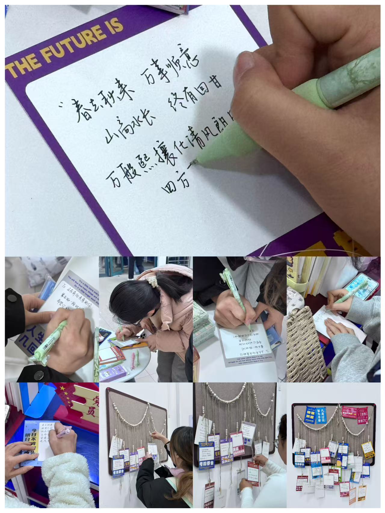 活动现场,同学们积极参与,手写祝福卡片、张贴鼓励语,凝聚跨学院的温暖力量。活动不仅缓解了备考压力,也强化了社区团结互助的氛围。