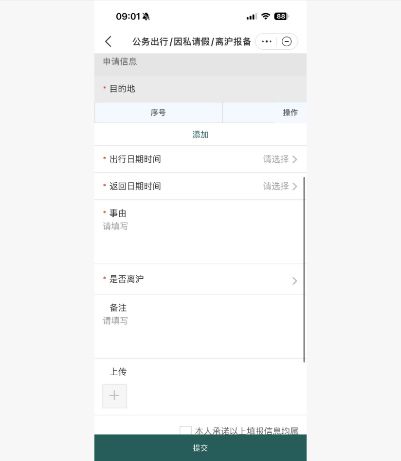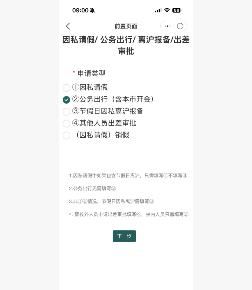 在职教职工、在校学生选择“公务出行”;校外人员选择“其他人员出差审批”