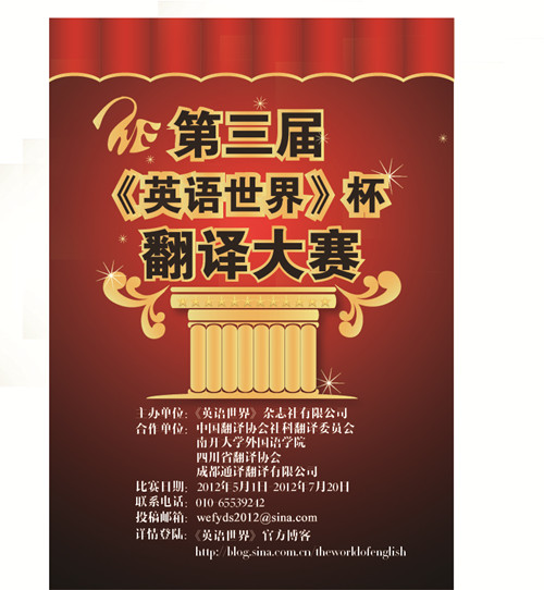 秉承“给力英语学习,探寻翻译之星”的理念,在前两届翻译大赛成功举办的基础上,《英语世界》杂志社将联合南开大学、中国翻译协会社科翻译委员会、四川省翻译协会和成都通译翻译有限公司共同举办第三届“《英语世界》杯”翻译大赛。欢迎广大英语爱好者,包括在书山学海奋力跋涉的莘莘学子,热情参与,晒秀佳译。