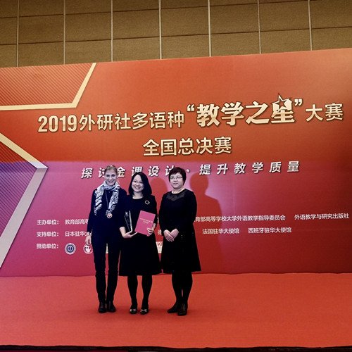 “教学之星”大赛由教育部高等学校外国语言文学类专业教学指导委员会、教育部高等学校大学外语教学指导委员会和外语教学与研究出版社共同举办,是全国规模最大、语种最多的高水平赛事,在高校外语教学领域有很大的影响力。刘璐老师历时大半年,经过初赛、复赛、决赛的层层角逐,脱颖而出,为外语学院德语系捧得第一个冠军奖杯。她在比赛中表现出优异的课堂节奏把控能力、教学设计能力、课堂组织能力和应变能力,以压倒性的优势取得了总决赛的冠军。