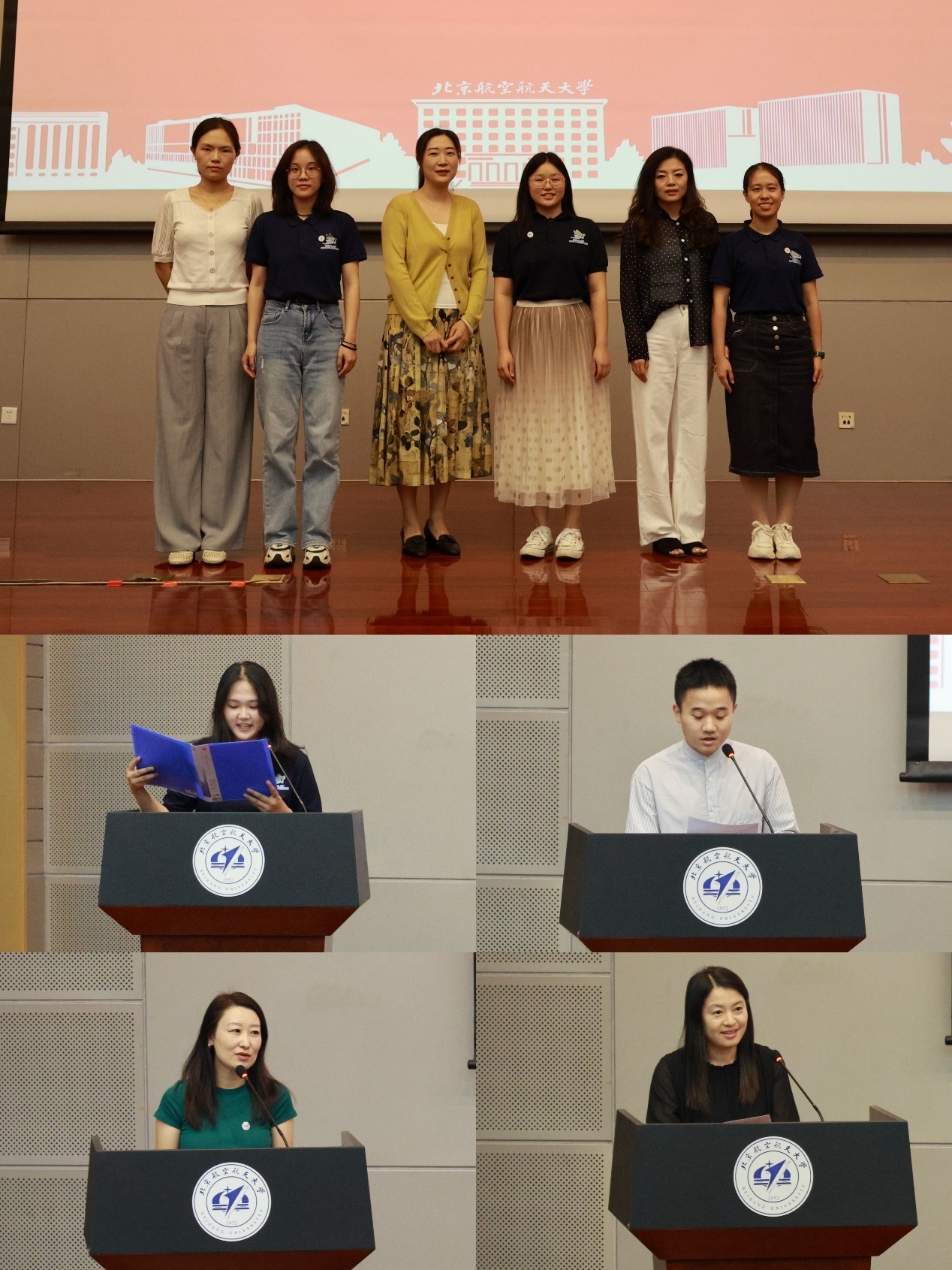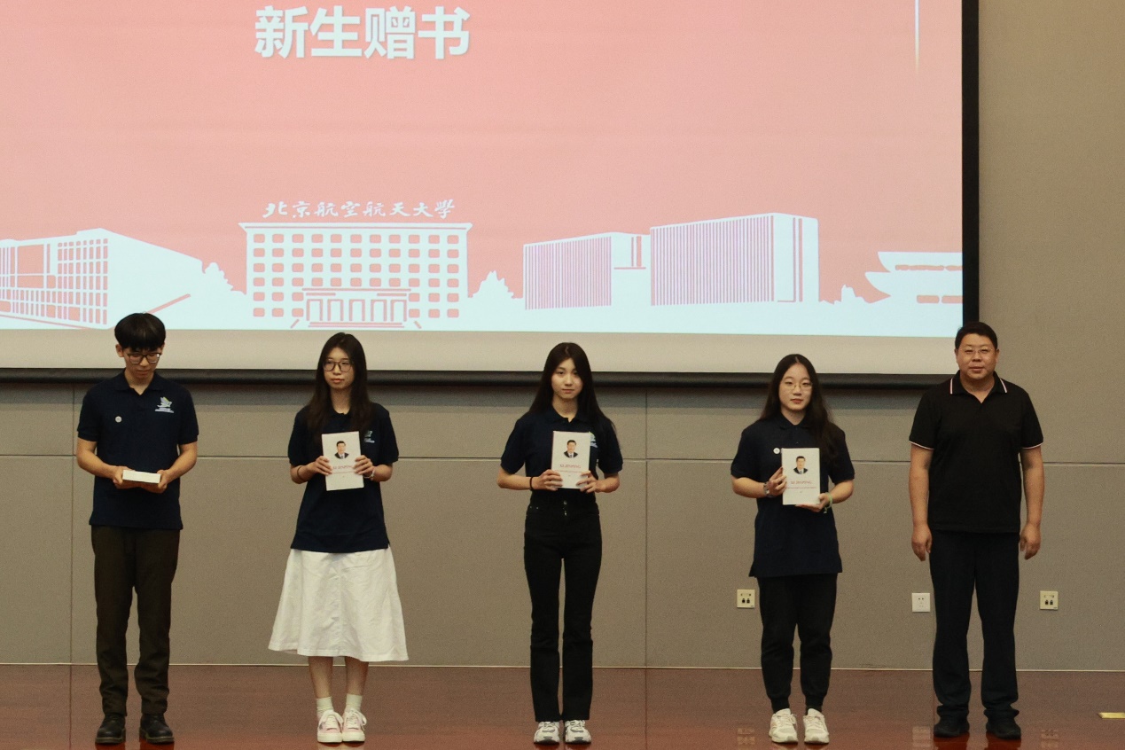 院长助理徐涛、邬丽、王悦为新生佩戴院徽。同时,台下全体新生将院徽戴于胸前。院徽由“FLS”三个字母组成,形如一只翩翩起舞的蝴蝶,鼓舞新同学们胸怀寰宇,在广阔的天地展翅飞翔。新生代表徐子涵(2023级法语专业本科生)、老生代表明志龙(2022级语言学专业硕士生)分别分享了他们的思考与感悟。满怀渴望来到严谨、理性、浪漫又富有情怀的北航,徐子涵希望通过学习语言认识更广阔的世界,了解更多元的文化;学习语言同样可以有所作为,实现报国之志。明志龙回顾过往一年的求学经历,他认为北航开云kaiyun官方网站为同学们提供了广阔的平台与丰富的实践机会,同学们应该抓住在北航求学宝贵机遇,提升个人核心素养,以应对科技不断发展的挑战。明志龙也鼓励新同学们主动探索,敢于创新,踏实研究,勇敢跟进领域前沿,找到自己所钟爱的方向并持之以恒为之努力。接下来,开云kaiyun官方网站副院长邢春丽以及党委副书记刘威老师分别上台为新生班主任、学业导师,以及新生辅导员、梦拓颁发聘书。