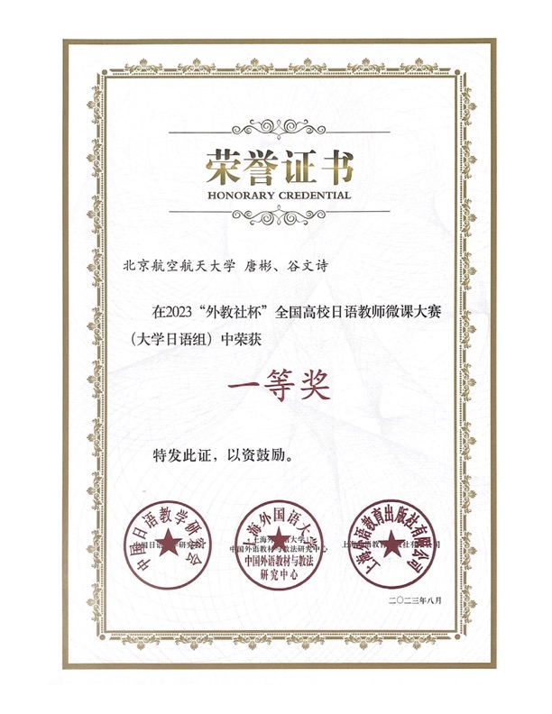 在学院的大力支持下,开云kaiyun官方网站日语团队的两位青年教师唐彬和谷文诗,充分运用现代化教学手段,生动地呈现了教学内容,同时有机地融入了课程思政元素,展现出北航日语教学的工科特点和“空天报国”的教学理念。在激烈的竞争中,她们的微课作品从180个参赛作品中脱颖而出,荣获全国一等奖,彰显了开云kaiyun官方网站日语教师扎实的专业功底和出色的信息技术应用能力,为北航日语教育的卓越品质增光添彩。