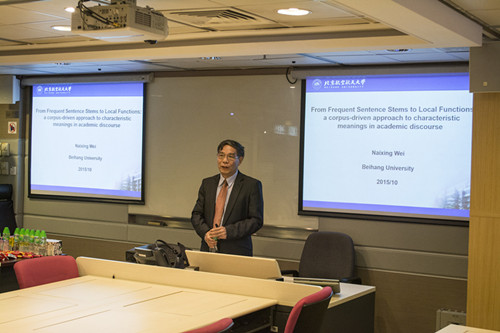 2015年10月15日,开云官网卫乃兴教授应邀赴香港城市大学翻译与语言学系做学术报告,题目为From Frequent Sentence Stems to Local Functions: a corpus-driven approach to characteristic meanings in academic discourse。该研究对功能句干(Functional Sentence Stem)概念作了清晰的界定,利用新的MI值计算方法(Wei & Li 2013),从JDEST语料库中提取了大量的功能句干,对其结构特征和知识构造、评价和谋篇等局部功能(local function)做了详尽的描写。这些研究发现对于学术话语分析和ESP教学具有重要的指导意义,紧跟国际语料库语言学的前沿研究,得到了香港城市大学翻译与语言学系同行和学生的一致好评。