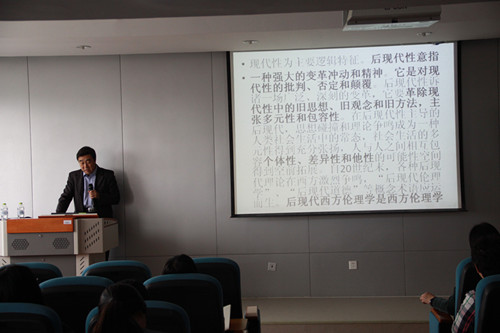 陈世丹教授从伦理学的两个基本概念说起,解释了伦理学的学理渊源和实际用途,讲述了后现代主义思潮的核心观念,并把伦理学放在后现代社会环境中,追溯了后现代伦理学概念的产生、与现代伦理学的关系,强调了其关注人类生存和发展的价值和意义,最后将后现代文学伦理与后现代叙事理论相结合,以美国小说家库尔特·冯内古特的作品为例展示了这种新的文学批评方法和理论视角的实际运用。在提问环节,陈世丹教授为师生们答疑解惑,现场气氛十分热烈。