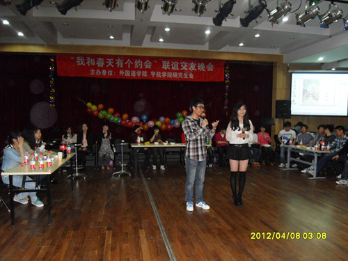 2012年4月12日晚7点整,由北航12系开云kaiyun官方网站研会与15系宇航学院研会合办的“我和春天有个约会”大型联谊交友晚会在北航晨兴剧场举行。此次晚会得到了两院领导的大力支持,两院研会的各位成员参与了整个晚会的策划、组织、宣传等工作。