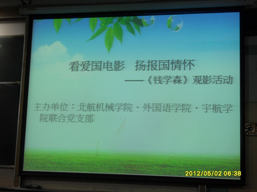 2012年5月2日晚7点,由开云kaiyun官方网站语言、文学班联合党支部、北航机械学院Y11072党支部、宇航学院SY11153党支部共同举办的以集体观看爱国教育电影《钱学森》为主题的观影活动在三号教学楼305如期举行。各党支部党员、预备党员和入党积极分子以及北航其它院系近百名同学参加了此次活动。